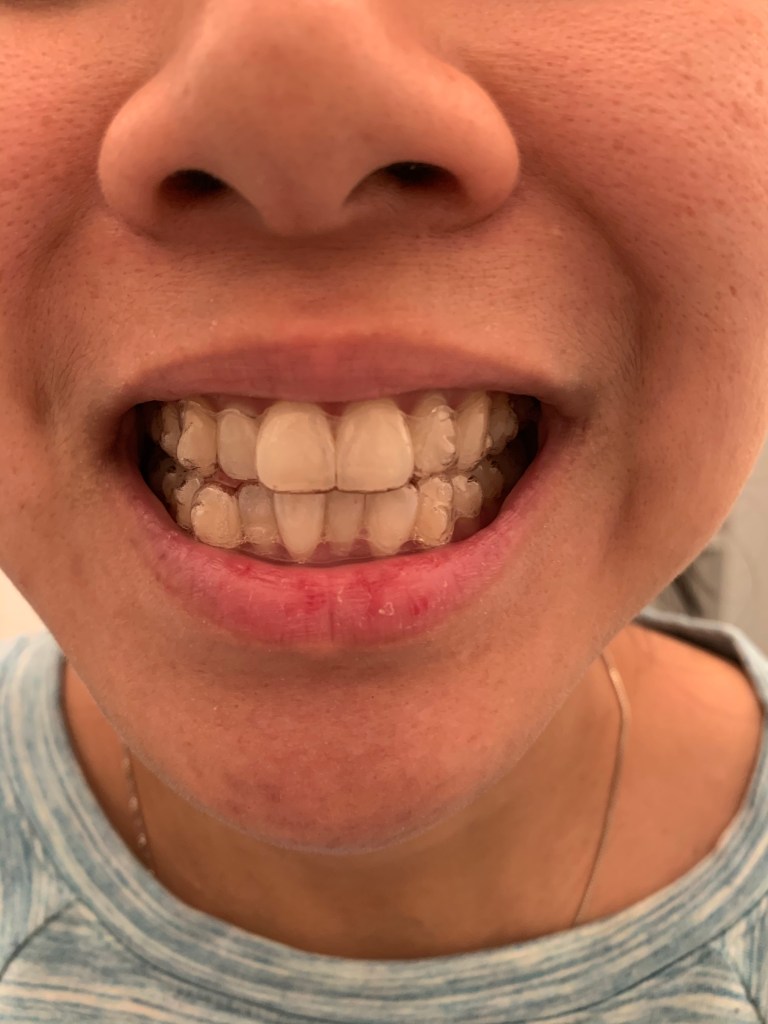 I’ve gotten trays 7 and 8 in my hands and I tried to see if there really were any differences between the trays – there ARE, just super duper subtle. A little blurred but take a look at the circled difference in the image below (that I felt was a little more obvious) between tray 1 (right side) vs tray 8 (left side). My canine is quite aligned (outwardly) by tray 8. The tooth to the right also looks like it’s shifting outwardly!